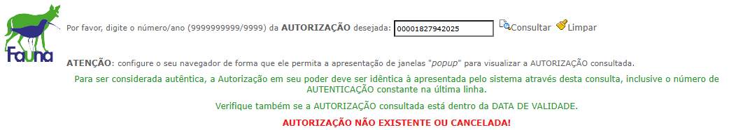 4. Caso contrário, aparecerá a mensagem em vermelho “AUTORIZAÇÃO NÃO EXISTENTE OU CANCELADA”, conforme imagem abaixo.